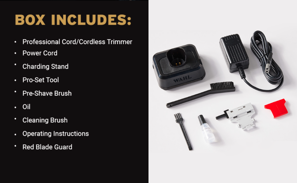 - Complete Kit: The package includes everything you need for a seamless grooming routine: a professional cord/cordless trimmer, a power cord for continuous use, a convenient charge stand, a pro-set tool for precision adjustments, a pre-shave brush, oil for maintenance, a cleaning brush for trimmer upkeep, operating instructions for hassle-free usage, and a red blade guard for safety and storage. This kit empowers you to achieve precision detailing and maintain your trimmer in top condition.